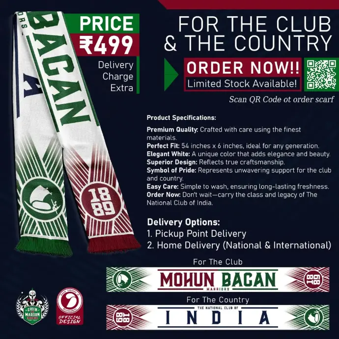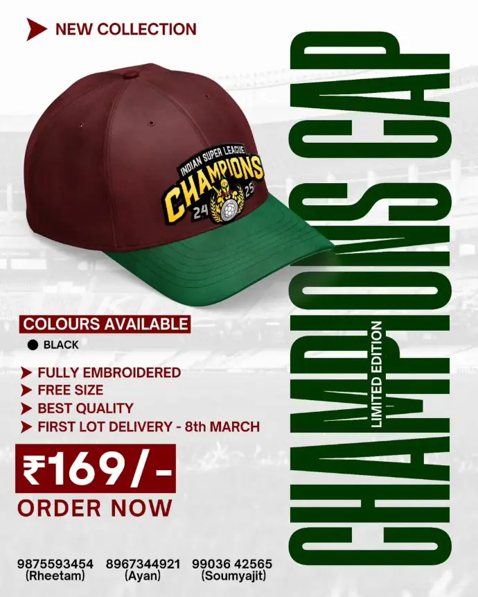 We proudly present our exclusive collection, which includes the Warriors Champions cap , a sophisticated Green and Maroon t-shirt, and the esteemed Mohunbagan scarf.